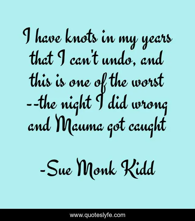 This page presents the quote "I have knots in my years that I can't undo, and this is one of the worst--the night I did wrong and Mauma got caught". Author of this quote is Sue Monk Kidd. .