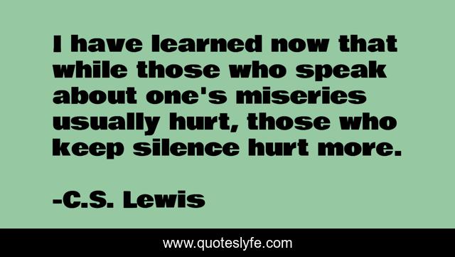 This page presents the quote "I have learned now that while those who speak about one's miseries usually hurt, those who keep silence hurt more.". Author of this quote is C.S. Lewis. This quote is about lewis, hurt, sad, truth, misery,.