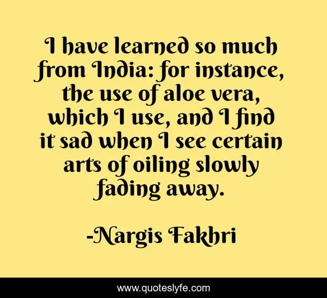 This page presents the quote "I have learned so much from India: for instance, the use of aloe vera, which I use, and I find it sad when I see certain arts of oiling slowly fading away.". Author of this quote is Nargis Fakhri. This quote is about see, india, find,.