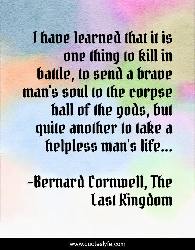 This page presents the quote "I have learned that it is one thing to kill in battle, to send a brave man's soul to the corpse hall of the gods, but quite another to take a helpless man's life...". Author of this quote is Bernard Cornwell, The Last Kingdom. This quote is about battle, death, revenge, war,.