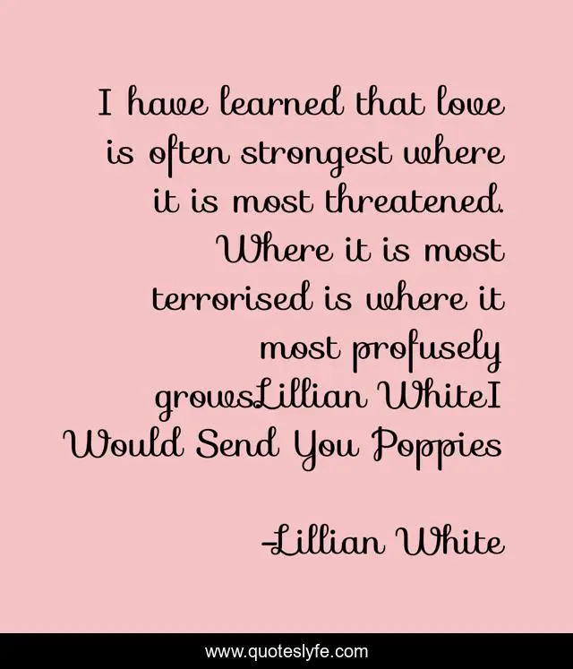 This page presents the quote "I have learned that love is often strongest where it is most threatened. Where it is most terrorised is where it most profusely grows.Lillian WhiteI Would Send You Poppies". Author of this quote is Lillian White. .