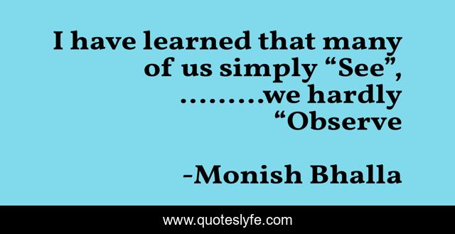 This page presents the quote "I have learned that many of us simply “See”, .........we hardly “Observe". Author of this quote is Monish Bhalla. This quote is about see, observe, learn, wisdom,.