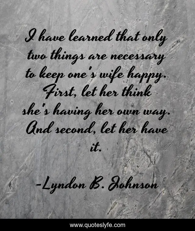 This page presents the quote "I have learned that only two things are necessary to keep one's wife happy. First, let her think she's having her own way. And second, let her have it.". Author of this quote is Lyndon B. Johnson. This quote is about happy, think, wife,.