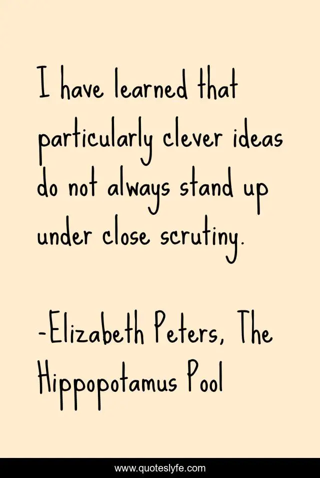 This page presents the quote "I have learned that particularly clever ideas do not always stand up under close scrutiny.". Author of this quote is Elizabeth Peters, The Hippopotamus Pool. This quote is about humor, ideas, scrutiny,.