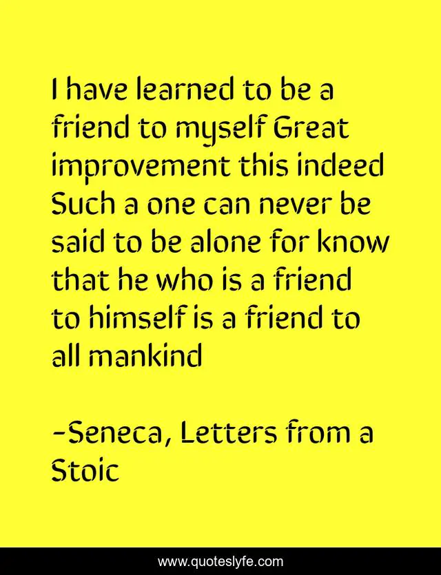 This page presents the quote "I have learned to be a friend to myself Great improvement this indeed Such a one can never be said to be alone for know that he who is a friend to himself is a friend to all mankind". Author of this quote is Seneca, Letters from a Stoic. This quote is about life, philosophy, stoic,.