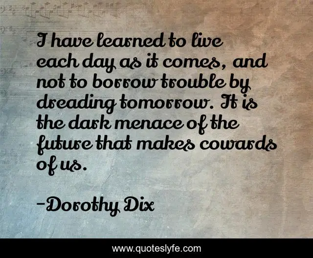 This page presents the quote "I have learned to live each day as it comes, and not to borrow trouble by dreading tomorrow. It is the dark menace of the future that makes cowards of us.". Author of this quote is Dorothy Dix. This quote is about dark, day, tomorrow,.