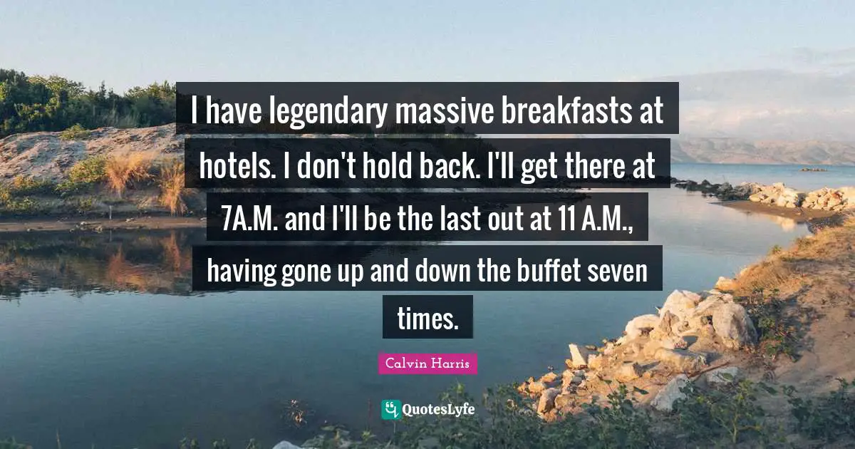 This page presents the quote "I have legendary massive breakfasts at hotels. I don't hold back. I'll get there at 7A.M. and I'll be the last out at 11 A.M., having gone up and down the buffet seven times.". Author of this quote is Calvin Harris. This quote is about breakfast, seven, legendary, gone, massive, up and down, buffets,.