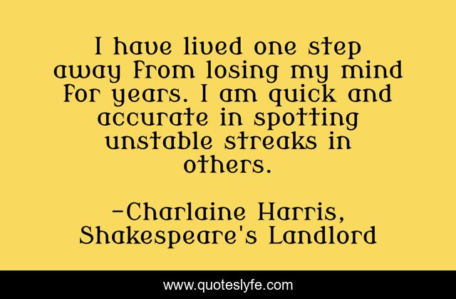This page presents the quote "I have lived one step away from losing my mind for years. I am quick and accurate in spotting unstable streaks in others.". Author of this quote is Charlaine Harris, Shakespeare's Landlord. This quote is about mystery, cozy, arkansas, shakespeare, lily, bard,.