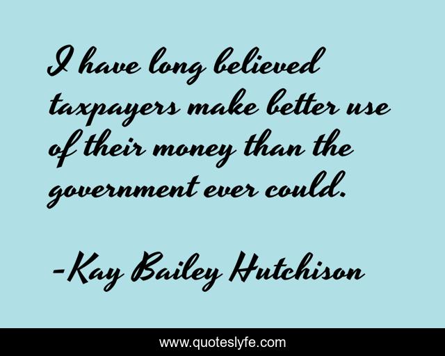This page presents the quote "I have long believed taxpayers make better use of their money than the government ever could.". Author of this quote is Kay Bailey Hutchison. This quote is about better, money, long,.