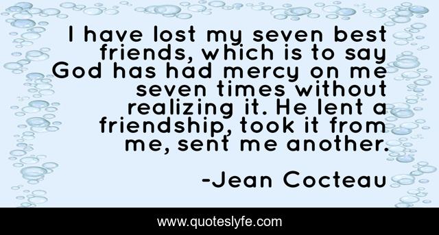 This page presents the quote "I have lost my seven best friends, which is to say God has had mercy on me seven times without realizing it. He lent a friendship, took it from me, sent me another.". Author of this quote is Jean Cocteau. This quote is about god, friends, best,.