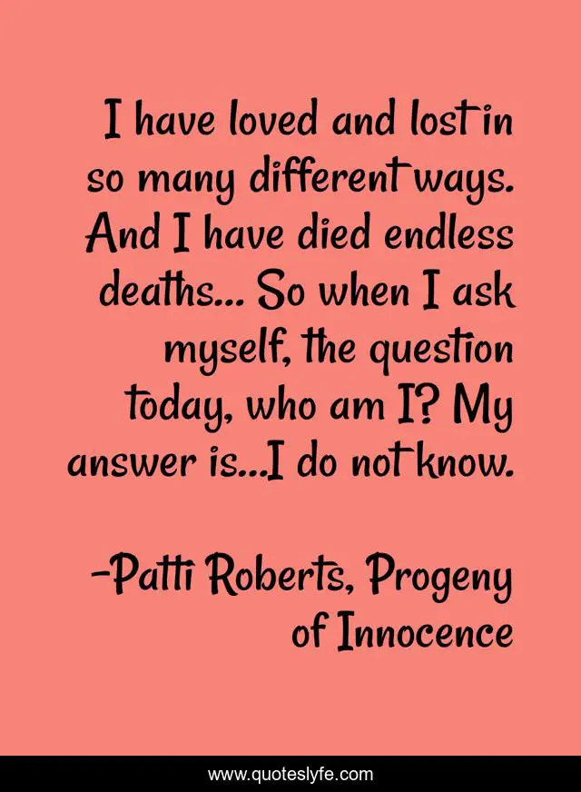 This page presents the quote "I have loved and lost in so many different ways. And I have died endless deaths… So when I ask myself, the question today, who am I? My answer is…I do not know.". Author of this quote is Patti Roberts, Progeny of Innocence. This quote is about loss, love, hearbreak, affection,.