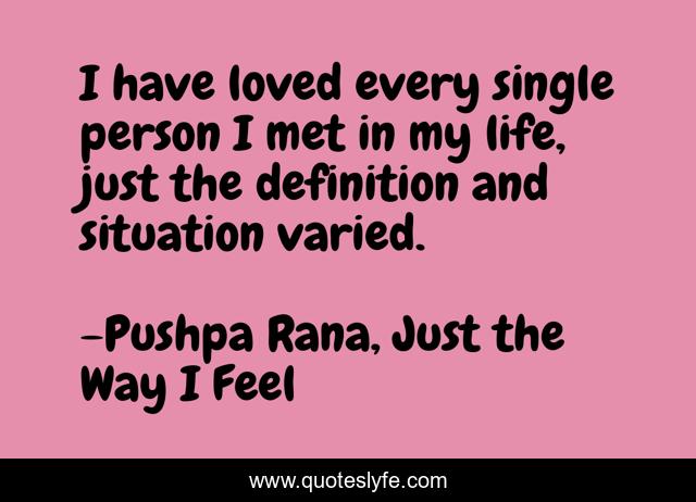 This page presents the quote "I have loved every single person I met in my life, just the definition and situation varied.". Author of this quote is Pushpa Rana, Just the Way I Feel. This quote is about definition, love, varied, person, situation, affection,.