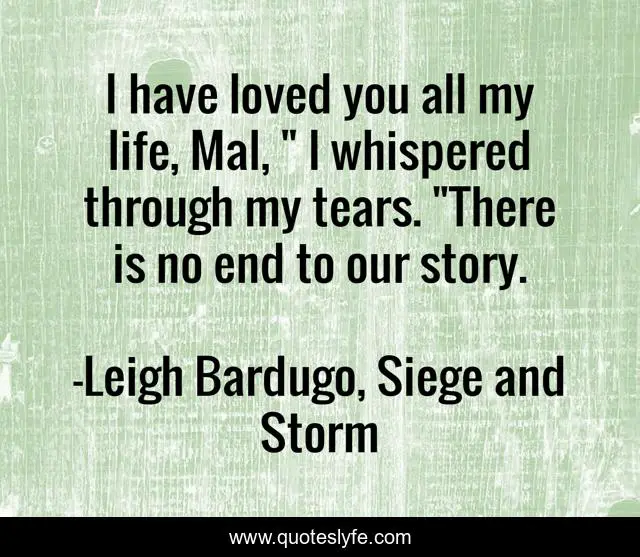 This page presents the quote "I have loved you all my life, Mal, " I whispered through my tears. "There is no end to our story.". Author of this quote is Leigh Bardugo, Siege and Storm. This quote is about alina, love, feels, affection, mal,.