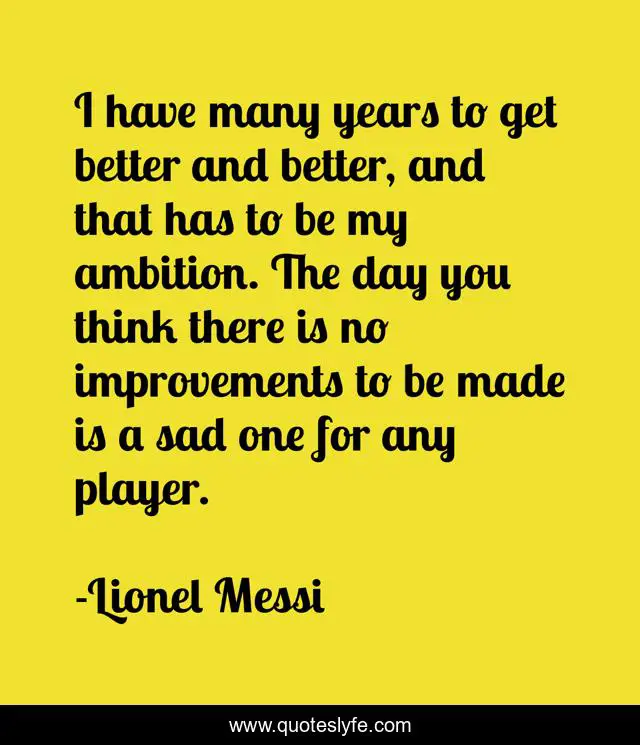 This page presents the quote "I have many years to get better and better, and that has to be my ambition. The day you think there is no improvements to be made is a sad one for any player.". Author of this quote is Lionel Messi. This quote is about ambition, think, day,.