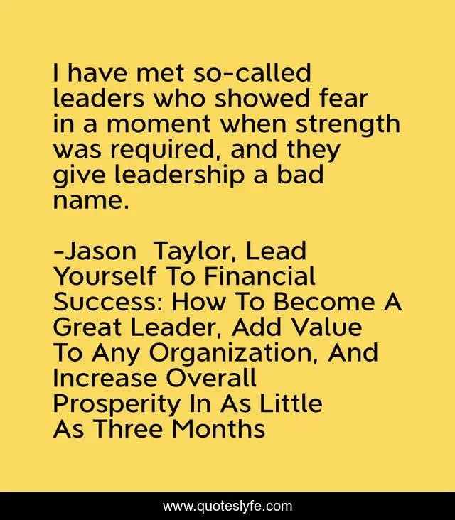 This page presents the quote "I have met so-called leaders who showed fear in a moment when strength was required, and they give leadership a bad name.". Author of this quote is Jason Taylor, Lead Yourself To Financial Success: How To Become A Great Leader, Add Value To Any Organization, And Increase Overall Prosperity In As Little As Three Months. .