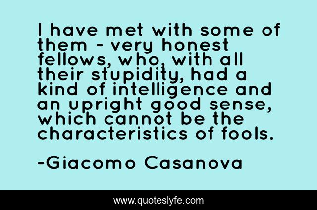 This page presents the quote "I have met with some of them - very honest fellows, who, with all their stupidity, had a kind of intelligence and an upright good sense, which cannot be the characteristics of fools.". Author of this quote is Giacomo Casanova. This quote is about stupidity, good, kind,.
