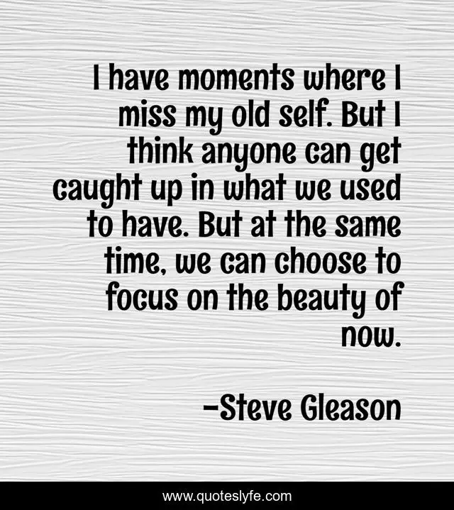 This page presents the quote "I have moments where I miss my old self. But I think anyone can get caught up in what we used to have. But at the same time, we can choose to focus on the beauty of now.". Author of this quote is Steve Gleason. This quote is about self, focus, beauty,.