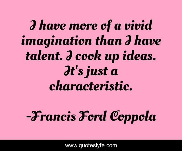 This page presents the quote "I have more of a vivid imagination than I have talent. I cook up ideas. It's just a characteristic.". Author of this quote is Francis Ford Coppola. This quote is about talent, ideas, up,.