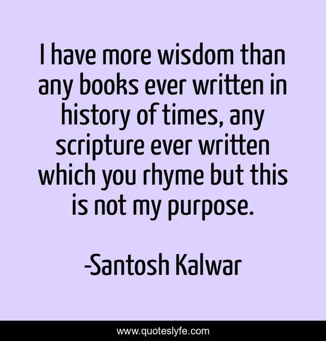 This page presents the quote "I have more wisdom than any books ever written in history of times, any scripture ever written which you rhyme but this is not my purpose.". Author of this quote is Santosh Kalwar. This quote is about purpose, life, book, poetry, wisdom,.
