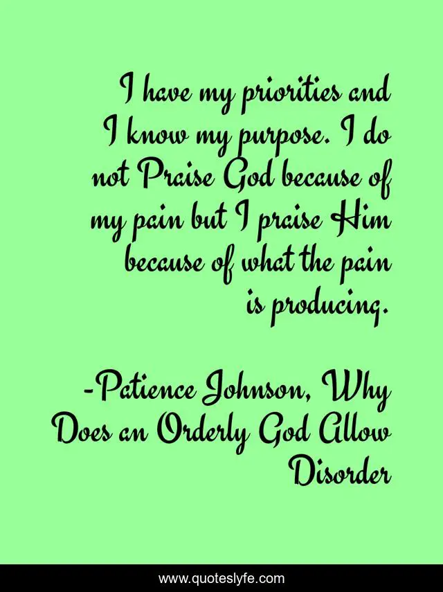 "Patience Johnson, Why Does an Orderly God Allow Disorder Quotes." Quoteslyfe.com, 2025. Fri. 05 Dec. 2025. <https://www.quoteslyfe.com/quote/I-have-my-priorities-and-I-know-20608>.