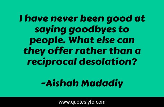 This page presents the quote "I have never been good at saying goodbyes to people. What else can they offer rather than a reciprocal desolation?". Author of this quote is Aishah Madadiy. This quote is about goodbyes, memories, separation,.