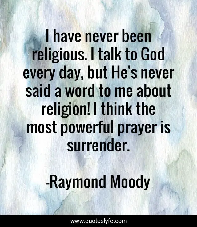 This page presents the quote "I have never been religious. I talk to God every day, but He's never said a word to me about religion! I think the most powerful prayer is surrender.". Author of this quote is Raymond Moody. This quote is about god, powerful, day,.