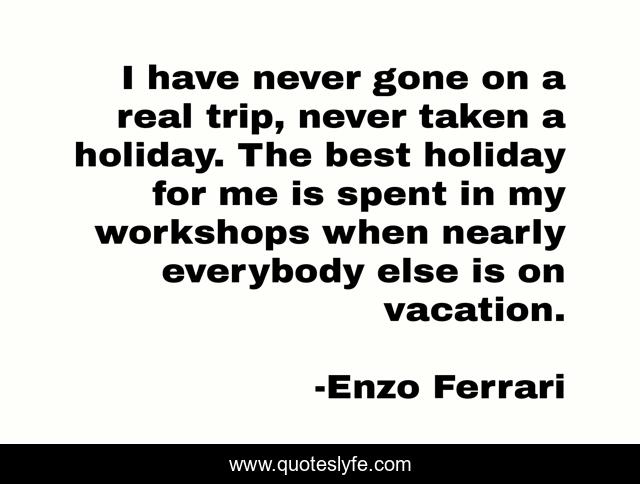 This page presents the quote "I have never gone on a real trip, never taken a holiday. The best holiday for me is spent in my workshops when nearly everybody else is on vacation.". Author of this quote is Enzo Ferrari. This quote is about me, holiday, vacation,.