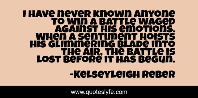 This page presents the quote "I have never known anyone to win a battle waged against his emotions. When a sentiment hoists his glimmering blade into the air, the battle is lost before it has begun.". Author of this quote is Kelseyleigh Reber. This quote is about emotional, philosophy, sentiments, battles-within, emotions,.