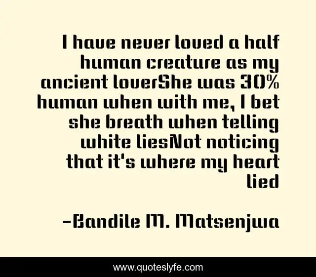 This page presents the quote "I have never loved a half human creature as my ancient loverShe was 30% human when with me, I bet she breath when telling white liesNot noticing that it's where my heart lied". Author of this quote is Bandile M. Matsenjwa. .