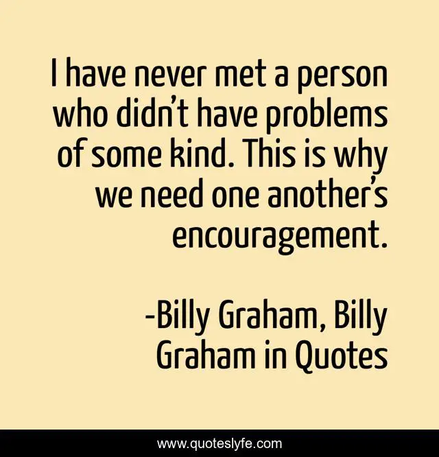 This page presents the quote "I have never met a person who didn’t have problems of some kind. This is why we need one another’s encouragement.". Author of this quote is Billy Graham, Billy Graham in Quotes. This quote is about billy-graham, people,.