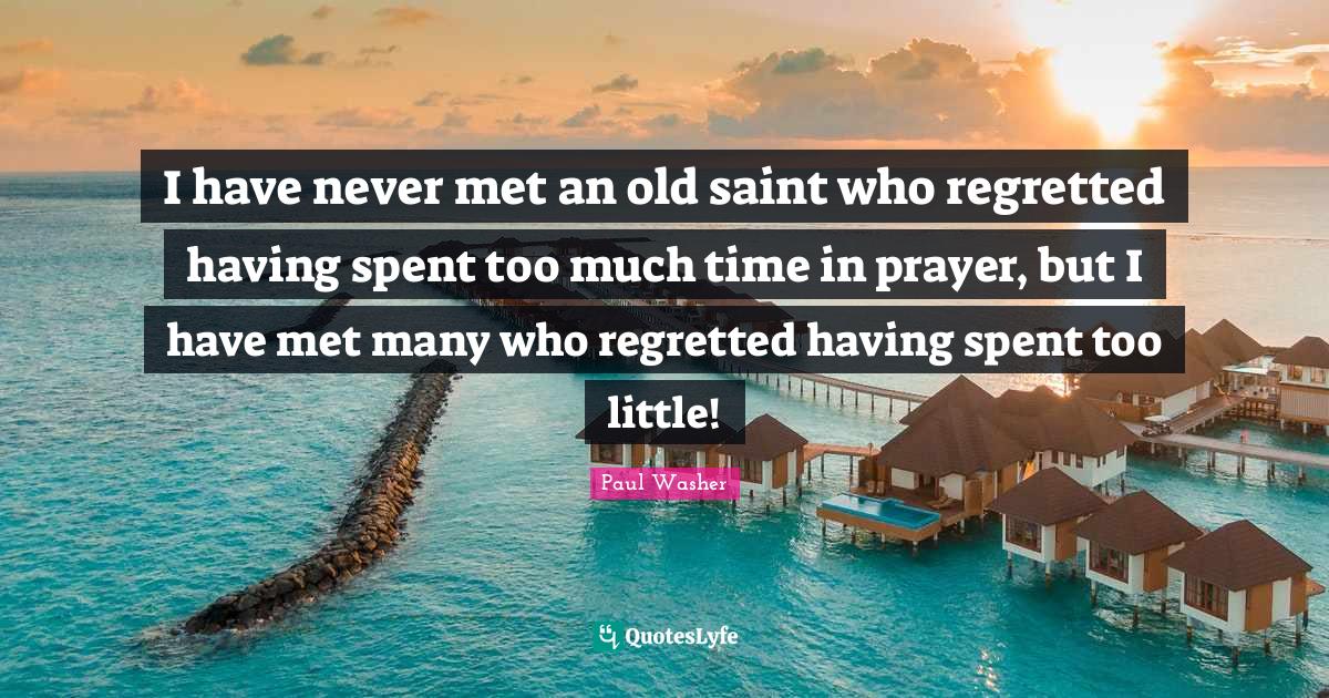 This page presents the quote "I have never met an old saint who regretted having spent too much time in prayer, but I have met many who regretted having spent too little!". Author of this quote is Paul Washer. This quote is about time, saint, littles, too much, prayer,.