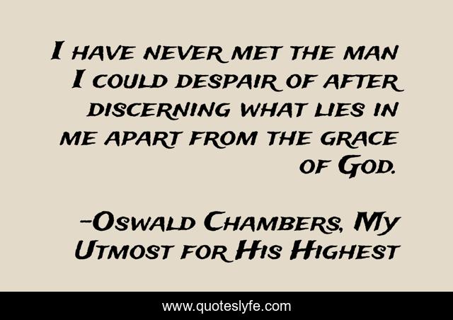 This page presents the quote "I have never met the man I could despair of after discerning what lies in me apart from the grace of God.". Author of this quote is Oswald Chambers, My Utmost for His Highest. This quote is about christian-living, insightful,.