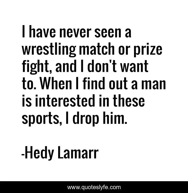 This page presents the quote "I have never seen a wrestling match or prize fight, and I don't want to. When I find out a man is interested in these sports, I drop him.". Author of this quote is Hedy Lamarr. This quote is about humor, men, wrestling,.