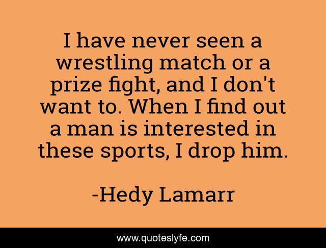 This page presents the quote "I have never seen a wrestling match or a prize fight, and I don't want to. When I find out a man is interested in these sports, I drop him.". Author of this quote is Hedy Lamarr. This quote is about man, fight,.