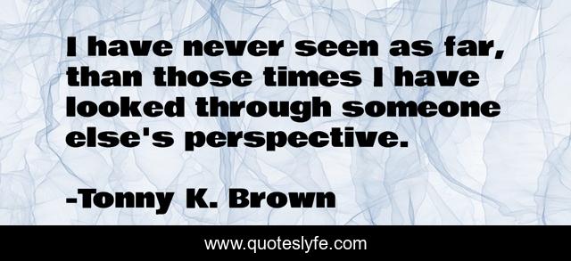 This page presents the quote "I have never seen as far, than those times I have looked through someone else's perspective.". Author of this quote is Tonny K. Brown. This quote is about friendship, love, affection, inspiration,.