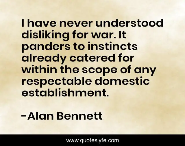 This page presents the quote "I have never understood disliking for war. It panders to instincts already catered for within the scope of any respectable domestic establishment.". Author of this quote is Alan Bennett. .