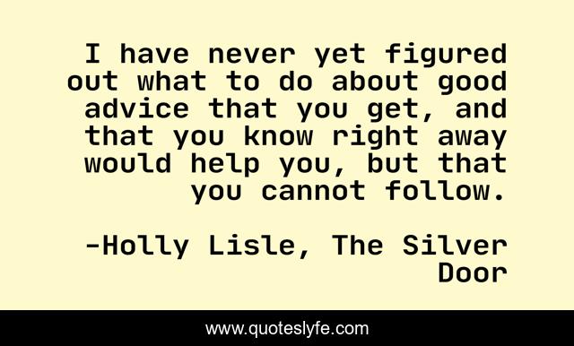 This page presents the quote "I have never yet figured out what to do about good advice that you get, and that you know right away would help you, but that you cannot follow.". Author of this quote is Holly Lisle, The Silver Door. This quote is about behaviour, advice, humor, attitude, frustration,.
