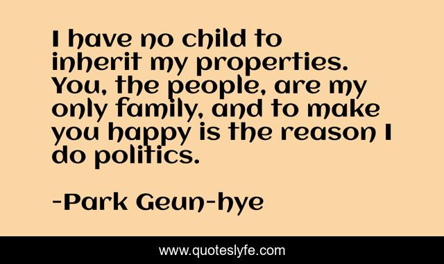 This page presents the quote "I have no child to inherit my properties. You, the people, are my only family, and to make you happy is the reason I do politics.". Author of this quote is Park Geun-hye. This quote is about happy, family, child,.
