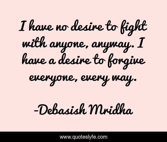 This page presents the quote "I have no desire to fight with anyone, anyway. I have a desire to forgive everyone, every way.". Author of this quote is Debasish Mridha. This quote is about philosophy, debasish-mridha, do-desire-to-fight, quotes, forgive-everyone, debasish-mridha-md, inspirational, enthusiasm, forgiveness,.