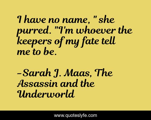 This page presents the quote "I have no name, " she purred. "I'm whoever the keepers of my fate tell me to be.". Author of this quote is Sarah J. Maas, The Assassin and the Underworld. This quote is about name, ball-scene, truth, significant, celaena-sardothien, dorian-havilliard,.