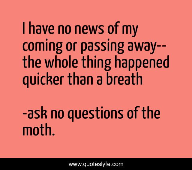 This page presents the quote "I have no news of my coming or passing away--the whole thing happened quicker than a breath". Author of this quote is ask no questions of the moth.. .