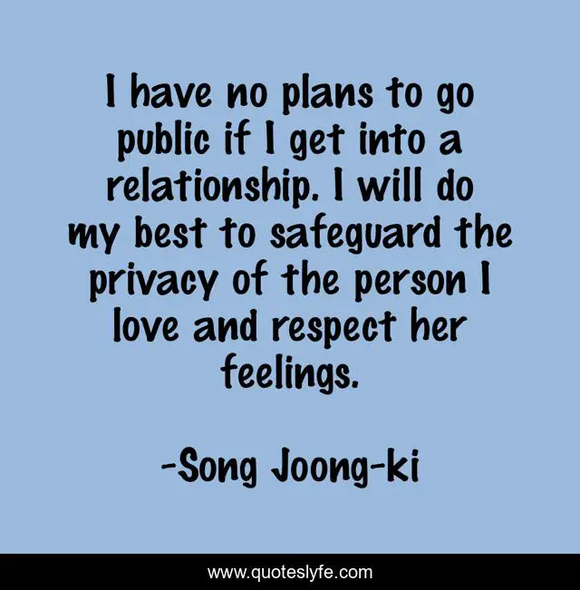 This page presents the quote "I have no plans to go public if I get into a relationship. I will do my best to safeguard the privacy of the person I love and respect her feelings.". Author of this quote is Song Joong-ki. This quote is about relationship, love, best, affection,.