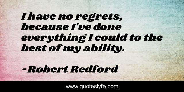 This page presents the quote "I have no regrets, because I've done everything I could to the best of my ability.". Author of this quote is Robert Redford. This quote is about done, regrets, no regrets,.