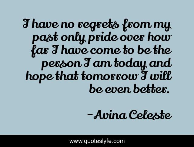 This page presents the quote "I have no regrets from my past only pride over how far I have come to be the person I am today and hope that tomorrow I will be even better.". Author of this quote is Avina Celeste. This quote is about confidence, positive, motivational, improvement, optimistic, inspirational, enthusiasm, pride, regrets,.