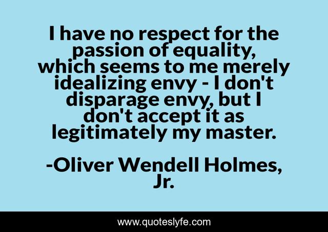 This page presents the quote "I have no respect for the passion of equality, which seems to me merely idealizing envy - I don't disparage envy, but I don't accept it as legitimately my master.". Author of this quote is Oliver Wendell Holmes, Jr.. This quote is about me, passion, equality,.