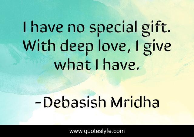 This page presents the quote "I have no special gift. With deep love, I give what I have.". Author of this quote is Debasish Mridha. This quote is about miraboli, oscar-wilde, philosophy, debasish-mridha, i-have-no-special-gift, quotes, i-give-what-i-have, debasish-mridha-md, inspirational,.
