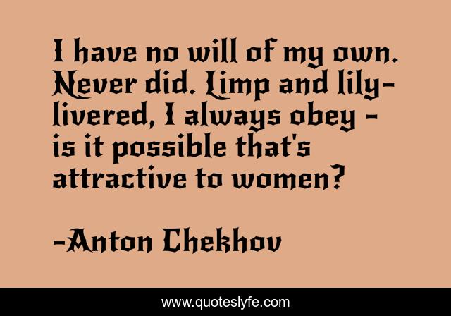 This page presents the quote "I have no will of my own. Never did. Limp and lily-livered, I always obey - is it possible that's attractive to women?". Author of this quote is Anton Chekhov. This quote is about seagull, chekhov, humor, women,.
