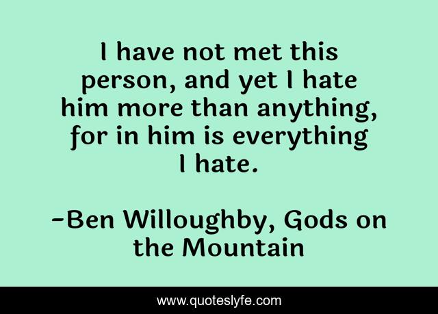 This page presents the quote "I have not met this person, and yet I hate him more than anything, for in him is everything I hate.". Author of this quote is Ben Willoughby, Gods on the Mountain. This quote is about hatred, hate,.
