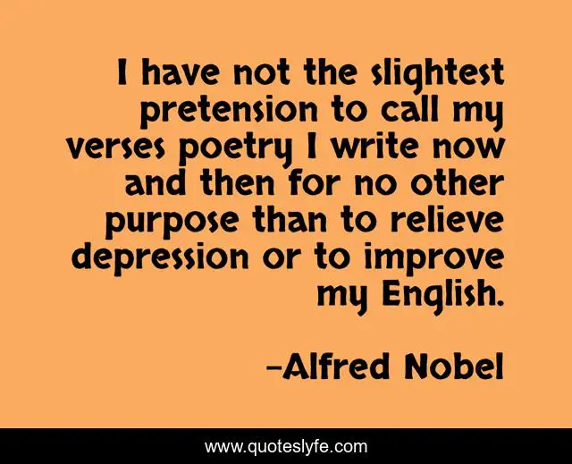 This page presents the quote "I have not the slightest pretension to call my verses poetry I write now and then for no other purpose than to relieve depression or to improve my English.". Author of this quote is Alfred Nobel. This quote is about purpose, depression, improve,.
