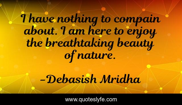 This page presents the quote "I have nothing to compain about. I am here to enjoy the breathtaking beauty of nature.". Author of this quote is Debasish Mridha. This quote is about enjoy, debasish, breathtaking-beauty-of-nature, mridha, philosophy, debasish-mridha, beauty-of-nature, complain,.